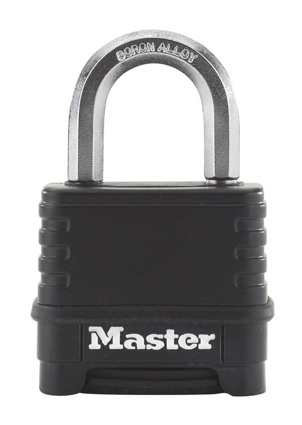 Kłódka wodoodporna EXCELL M178EURD firmy Master Lock. Laminowane stalowe kłódki z termoplastyczną powłoką idealnie sprawdzają się podczas ekstremalnie trudnych warunków atmosferycznych. Opatentowana ośmioboczna w przekroju szekla, wykonana jest ze stopu boru dzięki czemu ma o 50% większą odporność na przecięcie niż hartowana stal.