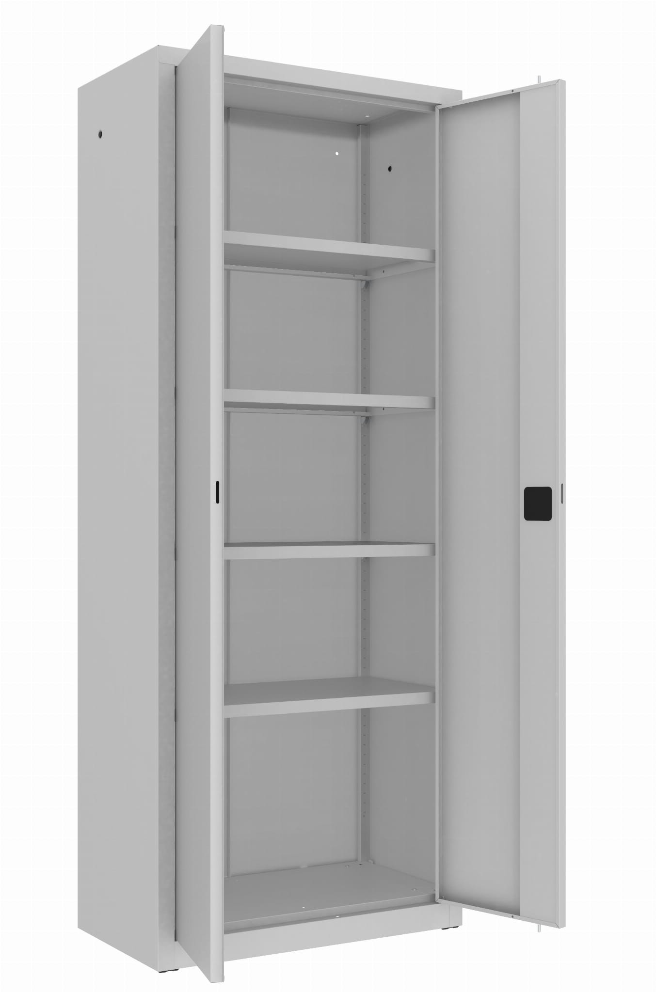 Drzwi skrzydłowe zamykane zamkiem kluczowym - wyposażone w schowane zawiasy dla estetycznego wyglądu, drzwi zamykane są na nowoczesny zamek kluczowy, który zapewnia bezpieczeństwo przechowywanych dokumentów.