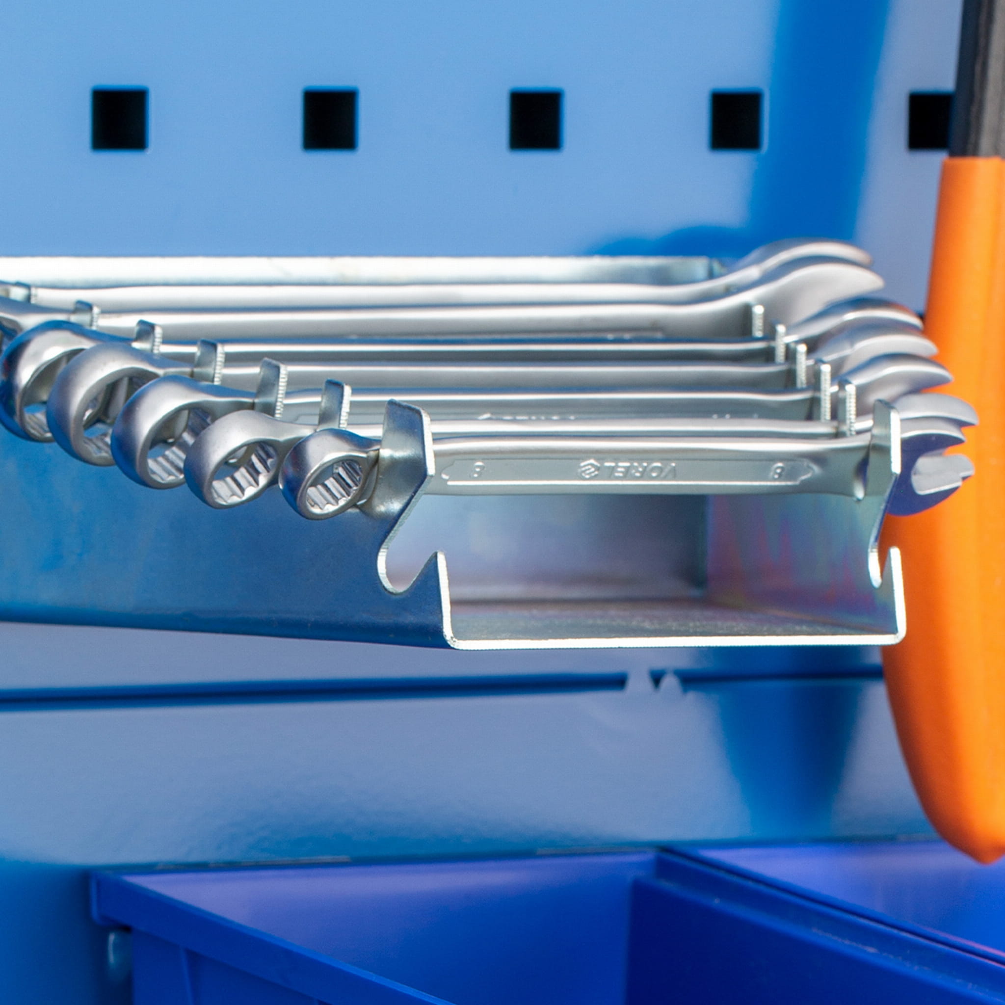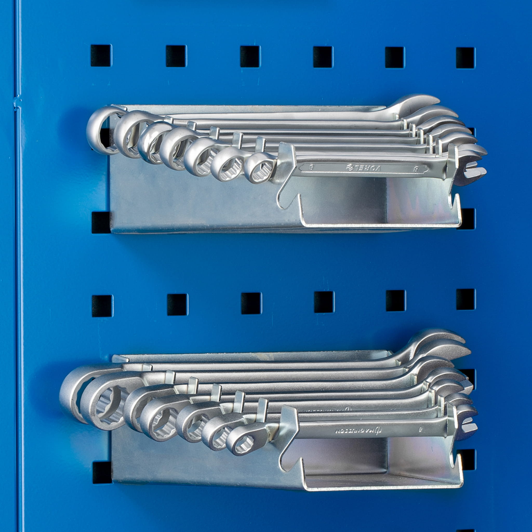 Poręczny uchwyt na klucze płaskie i płasko-oczkowe pozwoli Ci przechować je bez bałaganu i zbędnego szukania. Możesz zawiesić półeczkę w dowolnym miejscu ścianki i mieć klucze pod ręką za każdym razem, gdy tego potrzebujesz. Uchwyt jest bardzo wytrzymały i wykazuje odporność na korozję, ponieważ został wykonany z ocynkowanej stali. Może zostać wykorzystany na perforowanych powierzchniach ścianek warsztatowych BRUNO, DAREK oraz SZYMON.