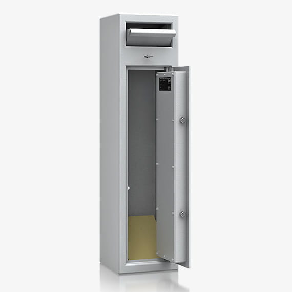 Model z wrzutnią usytuowaną z przodu sejfu, otwieraną do dołu z blachą odprowadzającą.