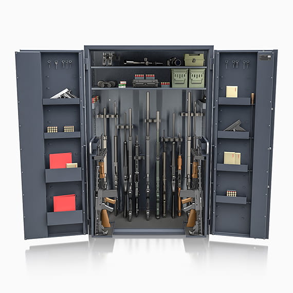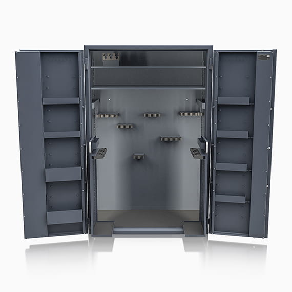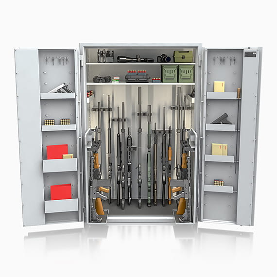 Uchwyty na przestawnych szynach mają możliwość regulacji na wysokość i głębokość sejfu. Dla większej wygody użytkowej zastosowano podział szyny na broń. Dzięki temu zabiegowi, nawet najkrótsza broń będzie mogła być odpowiednio i bezpiecznie umieszczona w sejfie na broń. Uchwyty na broń mocowane na magnesach mogą służyć do ustawiania broni krótkiej.