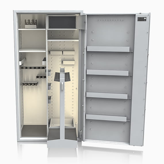 - przestawne na wysokości półki z uchwytami na broń krótką - pozwalają dowolnie spersonalizować wnętrze umożliwiając dogodne ustawienie broni o różnej wysokości.