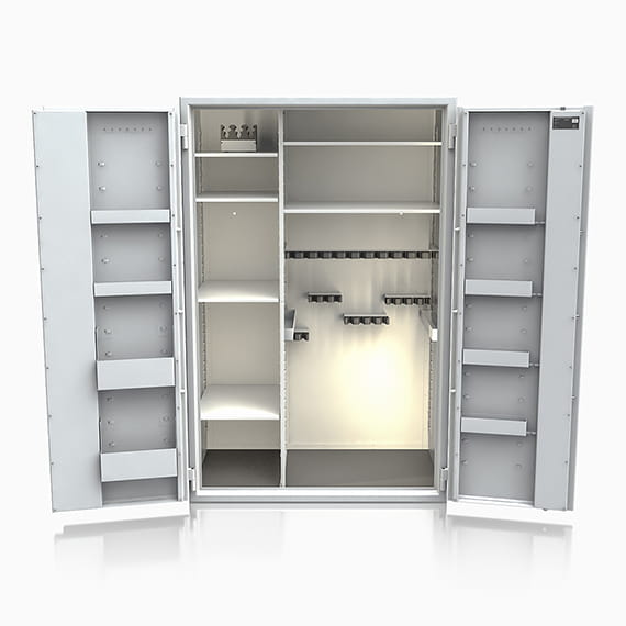 W zależności od modelu - szafy Siegen Super Kombi posiadają indywidulane wyposażenie pozwalające na dobranie modelu według własnych potrzeb. Każda z szaf wyposażona jest w piankowe dywaniki na dnie sejfu.