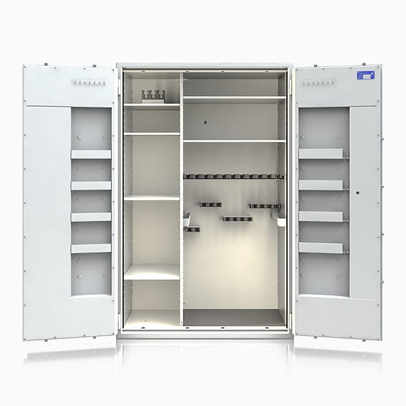 - przestawne na wysokości półki z uchwytami na broń krótką - pozwalają dowolnie spersonalizować wnętrze umożliwiając dogodne ustawienie broni o różnej wysokości.