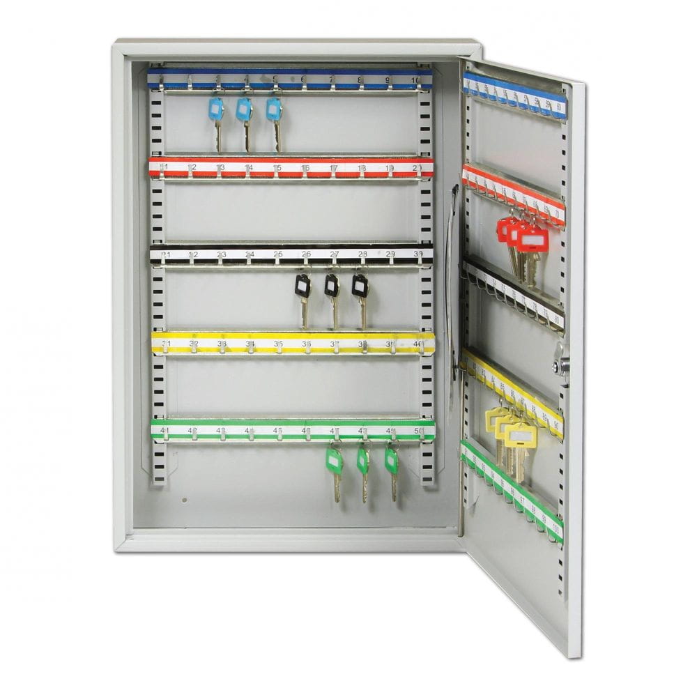 Dzięki drzwiczkom zamykanym na klucz, szafka zapewnia wygodę użytkowania oraz zabezpieczenie przetrzymywanych w niej kluczy przed osobami niepożądanymi. Listwy na których znajdują się haczyki na klucze zostały oznaczone różnymi kolorami oraz zezwalają na ustawienie pożądanego rozstawu między nimi.