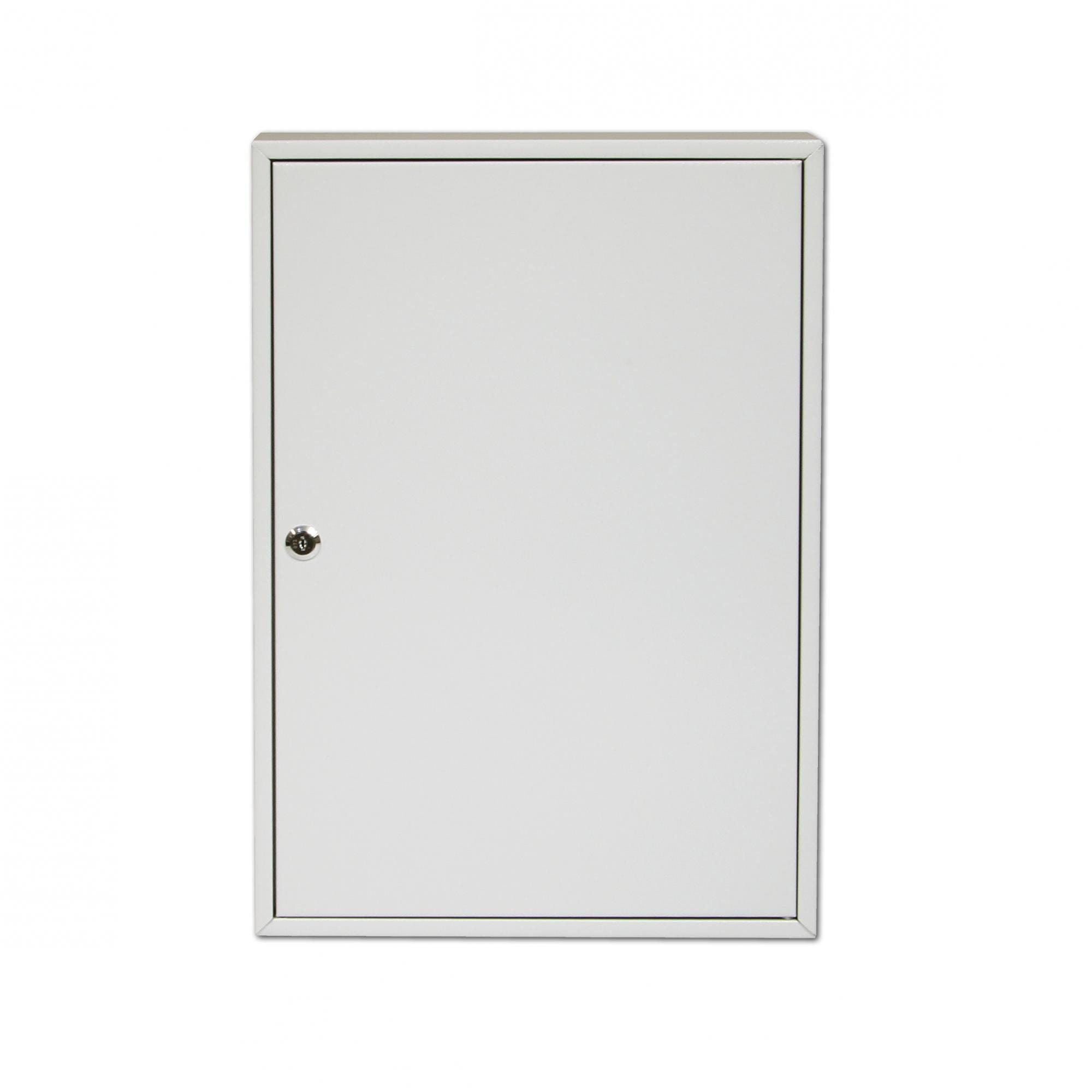 Zamykana szafka na 100 kluczy z możliwością regulowania odległości listw z haczykami. Szafka została wykonana z blachy stalowej malowanej proszkowo na kolor jasnoszary RAL 7035.