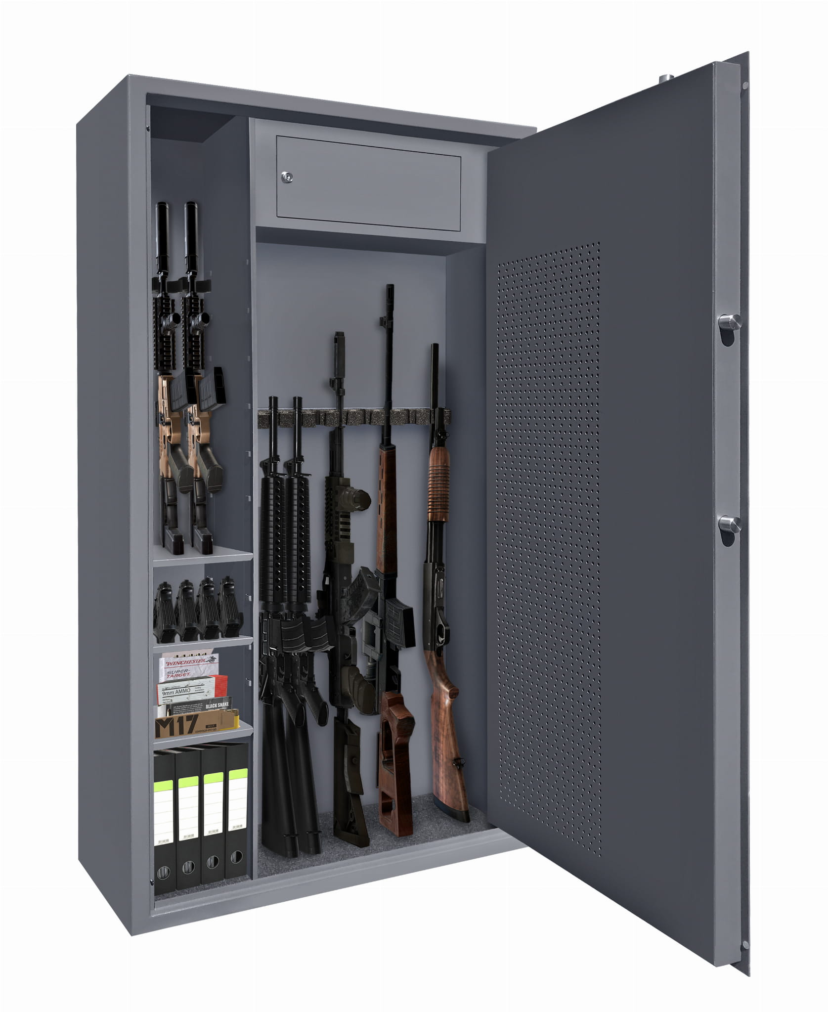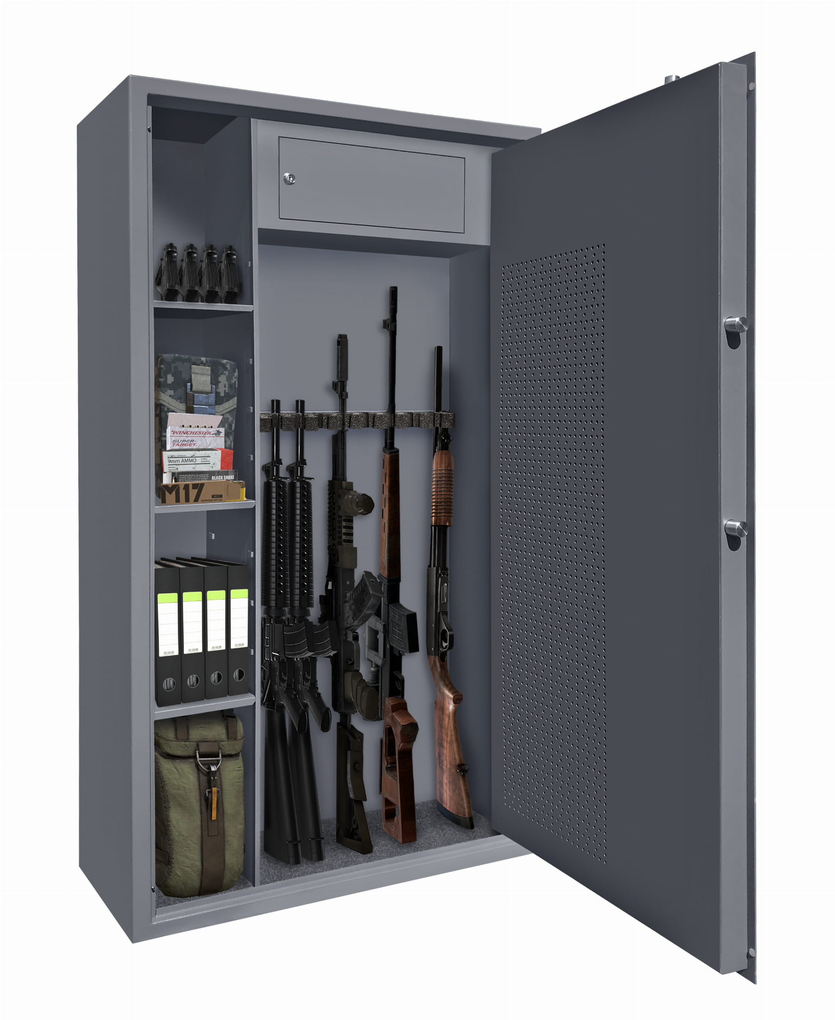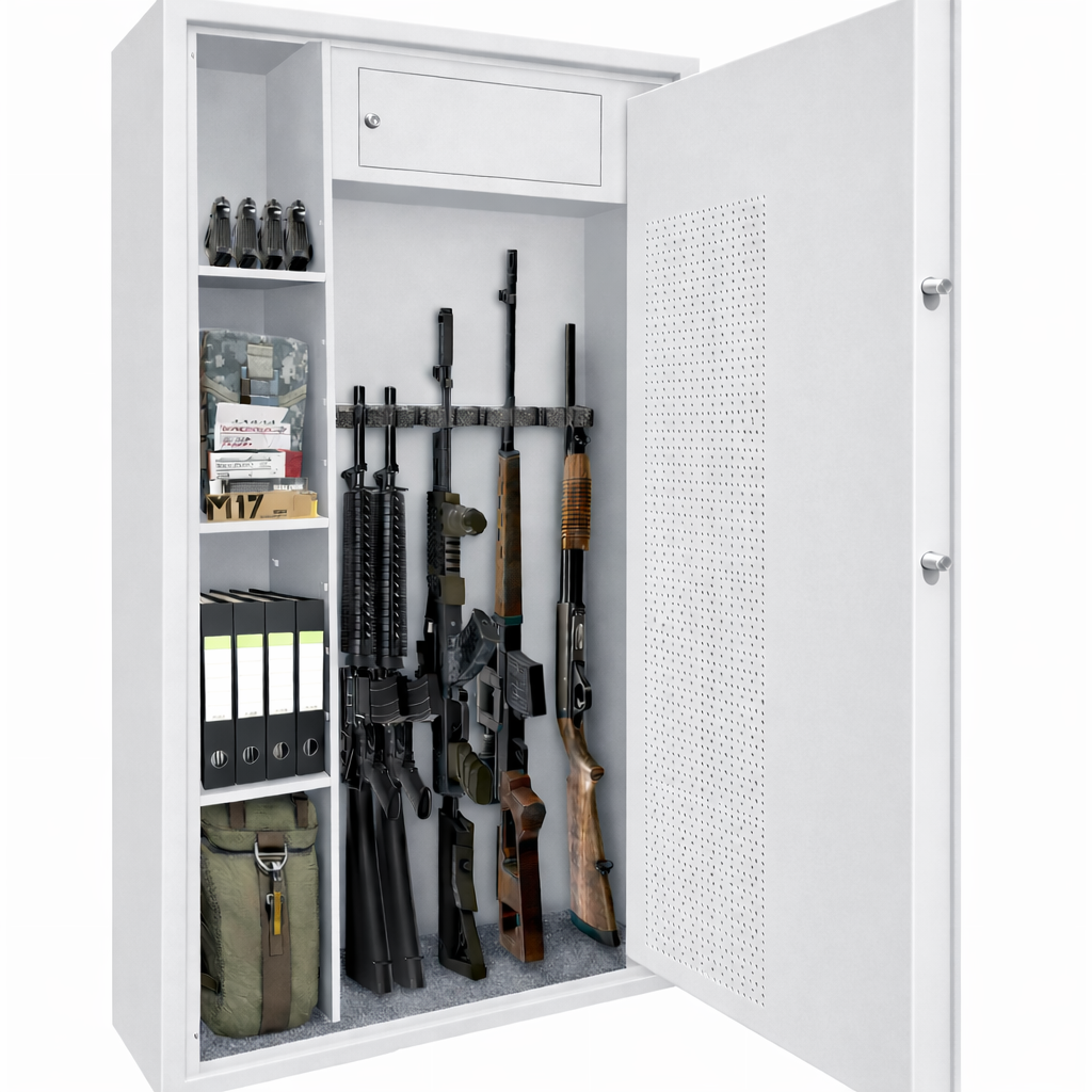 Sejf Arsenal 1470 klasy S1 do przechowywania broni palnej z dodatkowymi półkami, skarbczykiem oraz perforacją, ułatwiającymi aranżację miejsca wewnątrz na dodatkowe akcesoria czy amunicję. Szafy na broń Arsenał spełniają wymogi prawne dotyczące przechowywania broni i amunicji, co jest potwierdzone certyfikatem Instytutu Mechaniki Precyzyjnej. Szafy dostępne są wersji z zamknięciem na klucz oraz zamkiem elektronicznym.