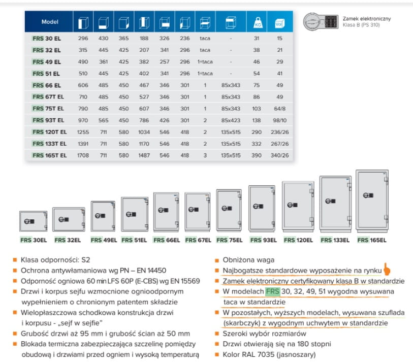 Sejfy FRS marki Valberg zaprojektowano aby skutecznie zabezpieczać przechowywane wewnątrz sejfu dokumenty oraz wartościowe przedmioty w przypadku pożaru - certyfikat LFS 60P który został nadany tym sejfom gwarantuje zabezpieczenie przed ogniem przez co najmniej 60 minut. Sejfy Valberg z linii FRS zapewniają również ochronę antywłamaniową - posiadają wysoką klasę odporności S2 podczas gdy zdecydowana większość dostępnych na rynku sejfów cechuje się klasą odporności S1 lub jej brakiem.