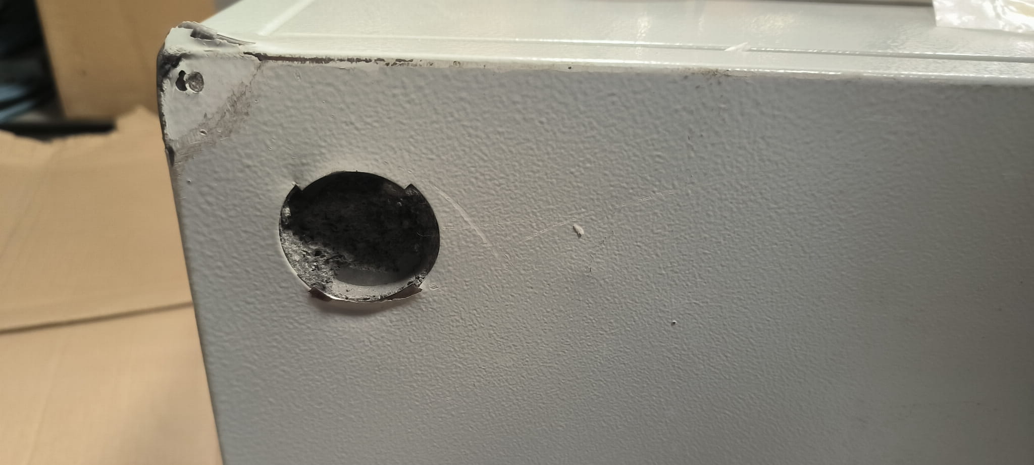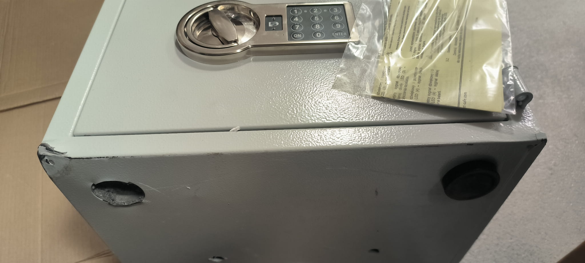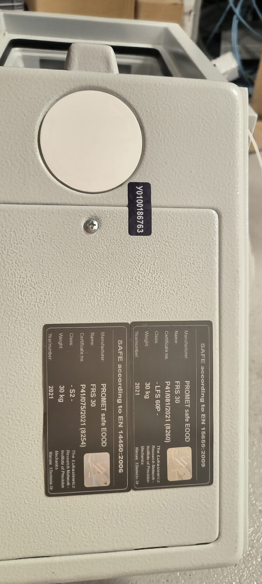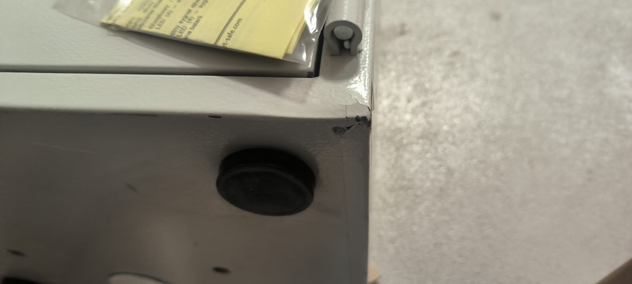 Sejf po uszkodzeniu transportowym z obitymi narożnikami i wyrwaną nóżką (zdjęcia w galerii). Sejf z 2021 roku, nie wiemy jak uszkodzenia wpływają na ognioodporność sejfu. Klasa S2 jest utrzymana.